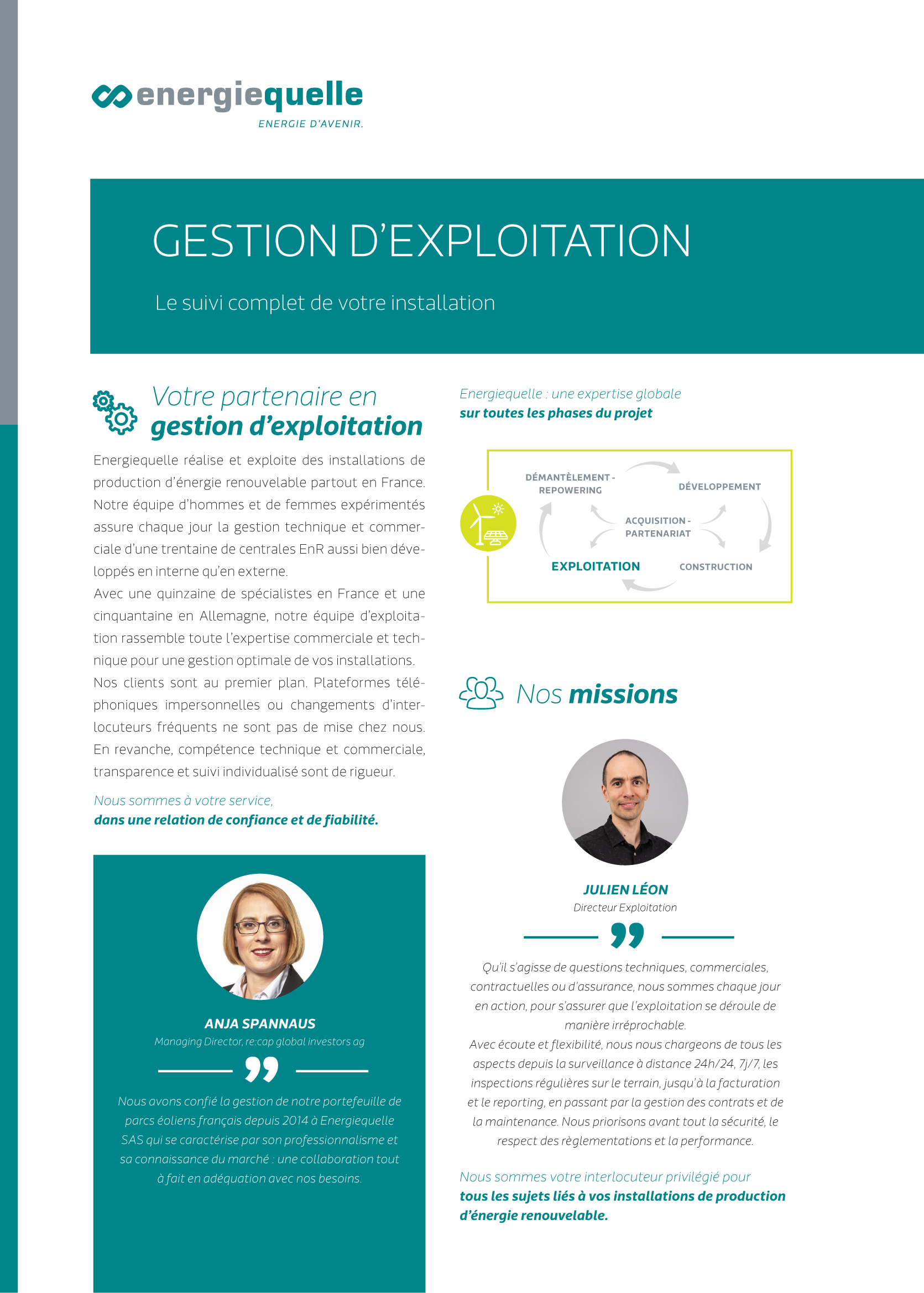 Qu’il s’agisse de questions techniques, commerciales, contractuelles ou d’assurance, nous sommes chaque jour en action, pour s’assurer que l’exploitation se déroule de manière irréprochable. Avec écoute et flexibilité, nous nous chargeons de tous les aspects depuis la surveillance à distance 24h/24, 7j/7, les inspections régulières sur le terrain, jusqu’à la facturation et le reporting, en passant par la gestion des contrats et de la maintenance.
